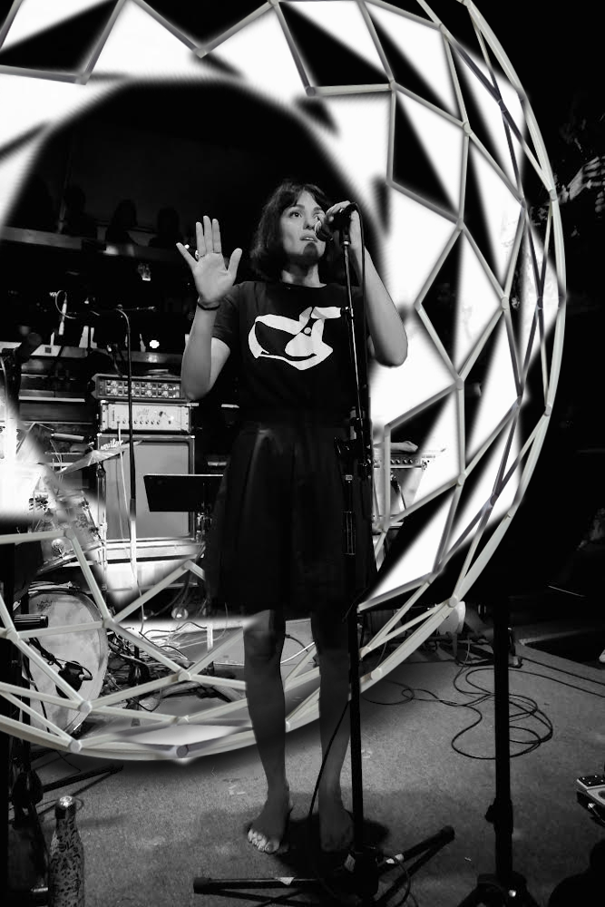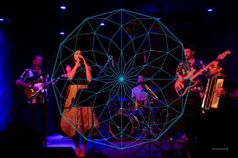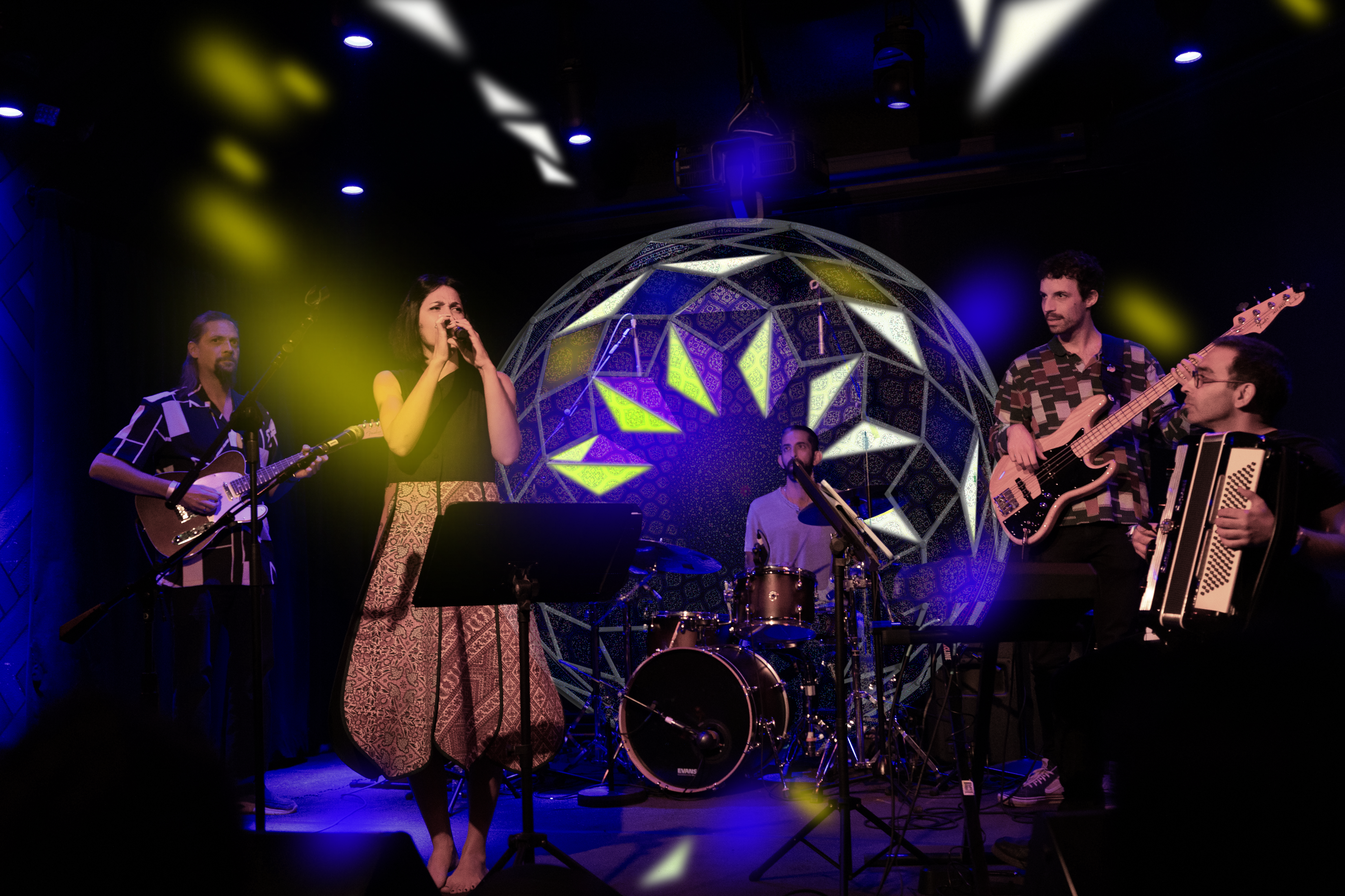 As the dome moves, it reflects the space and casts colors on surrounding faces. It can be part of a solo set, a full-band show, or run on playback.